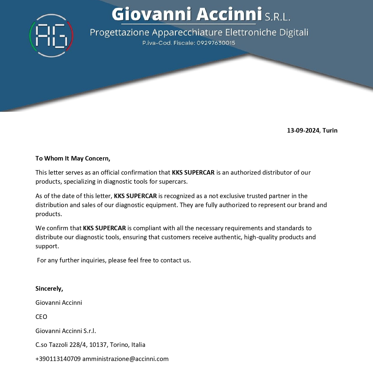We are proud to be an authorized distributor of Giovanni Accinni S.R.L., a leader in diagnostic tools for supercars.